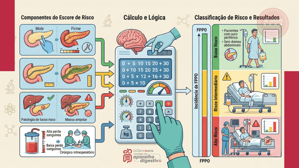 A prevenção da POPF não começa na síntese, mas na avaliação tátil e visual da glândula. O Fistula Risk Score (FRS) é uma ferramenta validada que estratifica o risco do paciente.