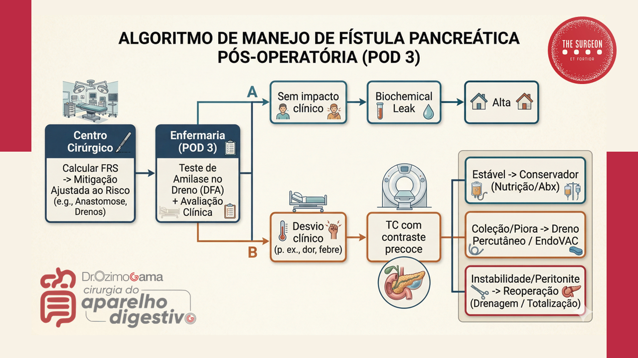 - O Teste do 3º Dia: A dosagem rotineira da amilase no fluido do dreno no 3º DPO dita o ritmo. Níveis baixos indicam a remoção precoce do dreno (evitando a infecção ascendente e a fístula mecânica induzida pelo próprio dreno). Níveis altos em um paciente com piora clínica impõem a realização imediata de uma Tomografia Computadorizada (TC) de abdome com duplo contraste para mapear coleções fluidas não drenadas.