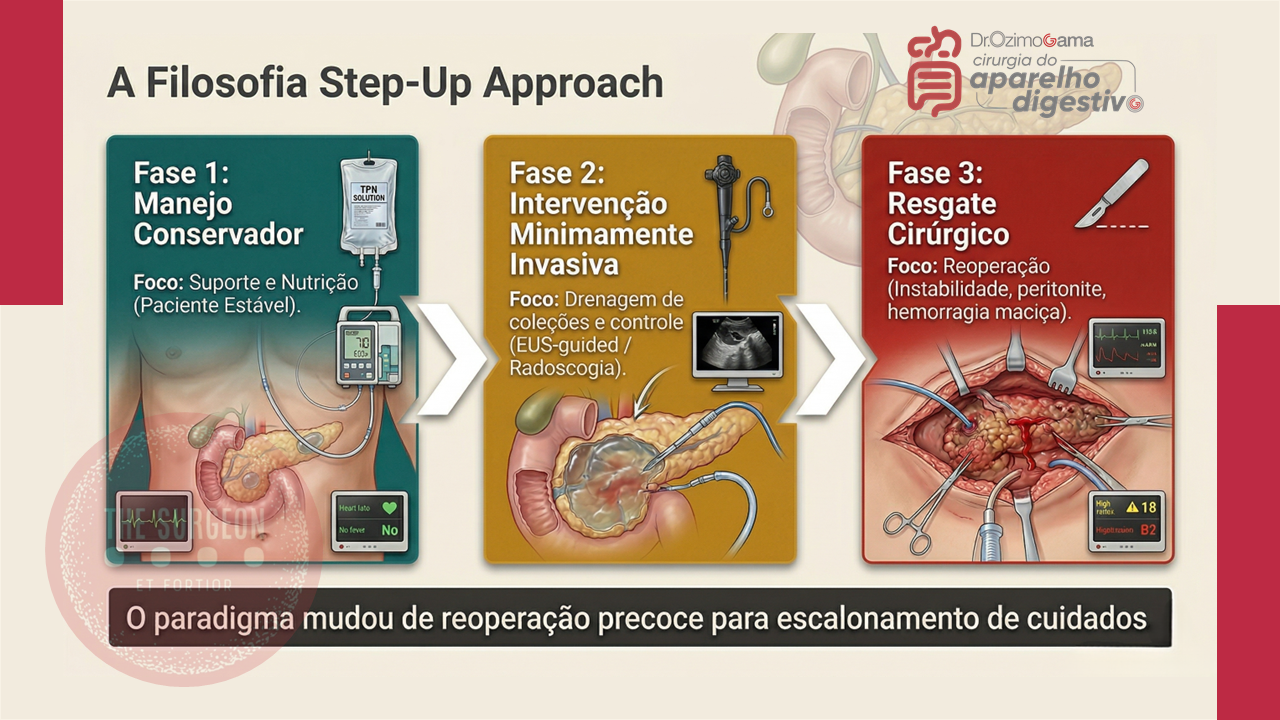 A excelência na execução de uma duodenopancreatectomia não isenta o cirurgião do risco de uma fístula pancreática. O vazamento enzimático é uma realidade inerente à biologia do pâncreas amolecido. Portanto, a verdadeira assinatura de um cirurgião do aparelho digestivo diferenciado não é apenas a técnica de anastomose que ele emprega, mas a sua implacável vigilância no pós-operatório. Compreender o momento exato de acionar a radiologia intervencionista e ter a coragem cirúrgica para reoperar um paciente em deterioração clínica (aplicando adequadamente a filosofia do step-up approach) são as atitudes éticas e técnicas que reduzem a mortalidade. Na cirurgia pancreática, o diagnóstico precoce é o único antídoto contra o desastre.