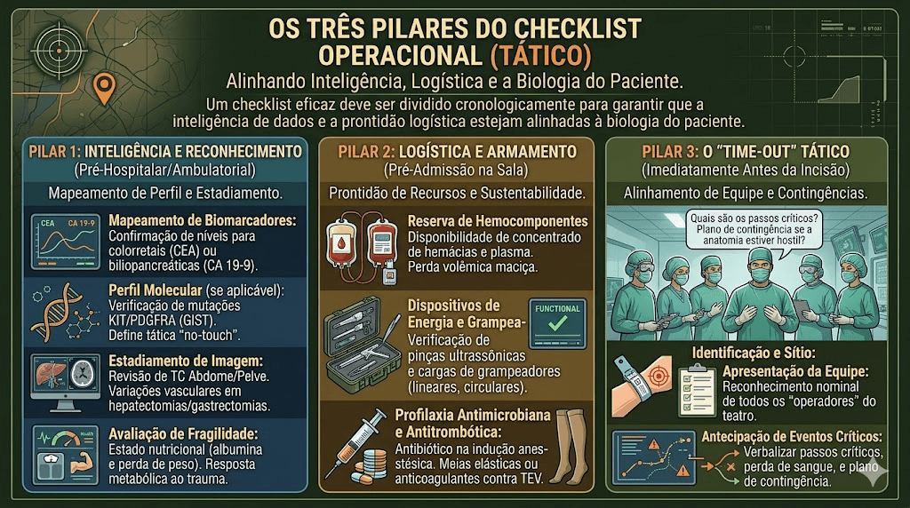 Um checklist eficaz deve ser dividido cronologicamente para garantir que a inteligência de dados e a prontidão logística estejam alinhadas à biologia do paciente.