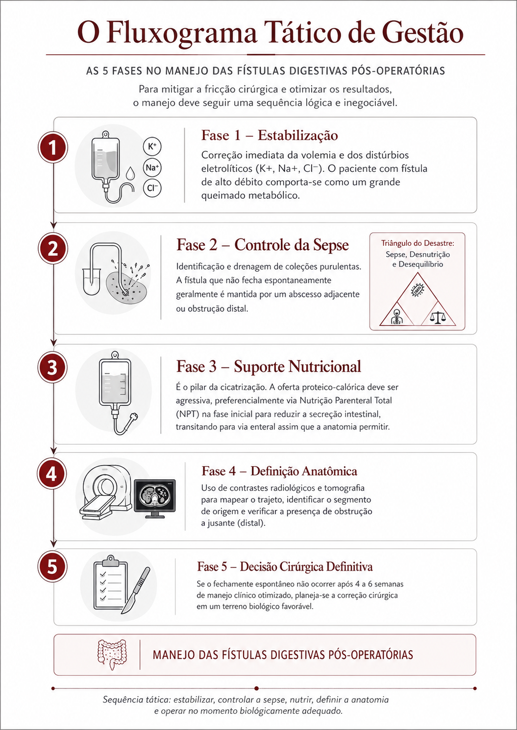 - Fase 2 – Controle da Sepse: Identificação e drenagem de coleções purulentas. A fístula que não fecha espontaneamente geralmente é mantida por um abcesso adjacente ou obstrução distal (O Triângulo de Desastre: Sepse, Desnutrição e Desequilíbrio).