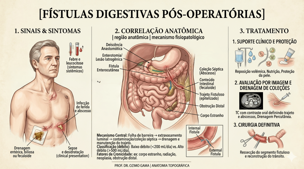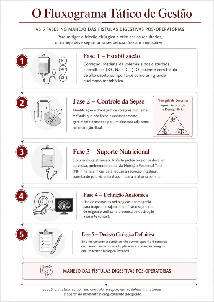 As fístulas digestivas pós-operatórias representam uma das complicações mais temidas e desafiadoras no teatro de operações da cirurgia do aparelho digestivo. Definidas como comunicações anormais entre o lúmen intestinal e o meio externo (fístulas enterocutâneas) ou outros órgãos, elas sinalizam a falência de uma anastomose ou sutura. Historicamente, essa condição era acompanhada por taxas de mortalidade proibitivas. O paradigma do tratamento mudou radicalmente após o trabalho clássico de Chapman et al. (1964), que demonstrou que a desnutrição era o principal determinante de óbito nestes pacientes, e não apenas a falha técnica em si. Antes dessa viragem, a indicação cirúrgica precoce para “fechar o buraco” resultava frequentemente em desastres, devido ao precário estado geral e à inflamação tecidual intensa. Este artigo propõe uma sistematização tática do manejo das fístulas, integrando o suporte metabólico à precisão diagnóstica e à decisão cirúrgica parcimoniosa.
